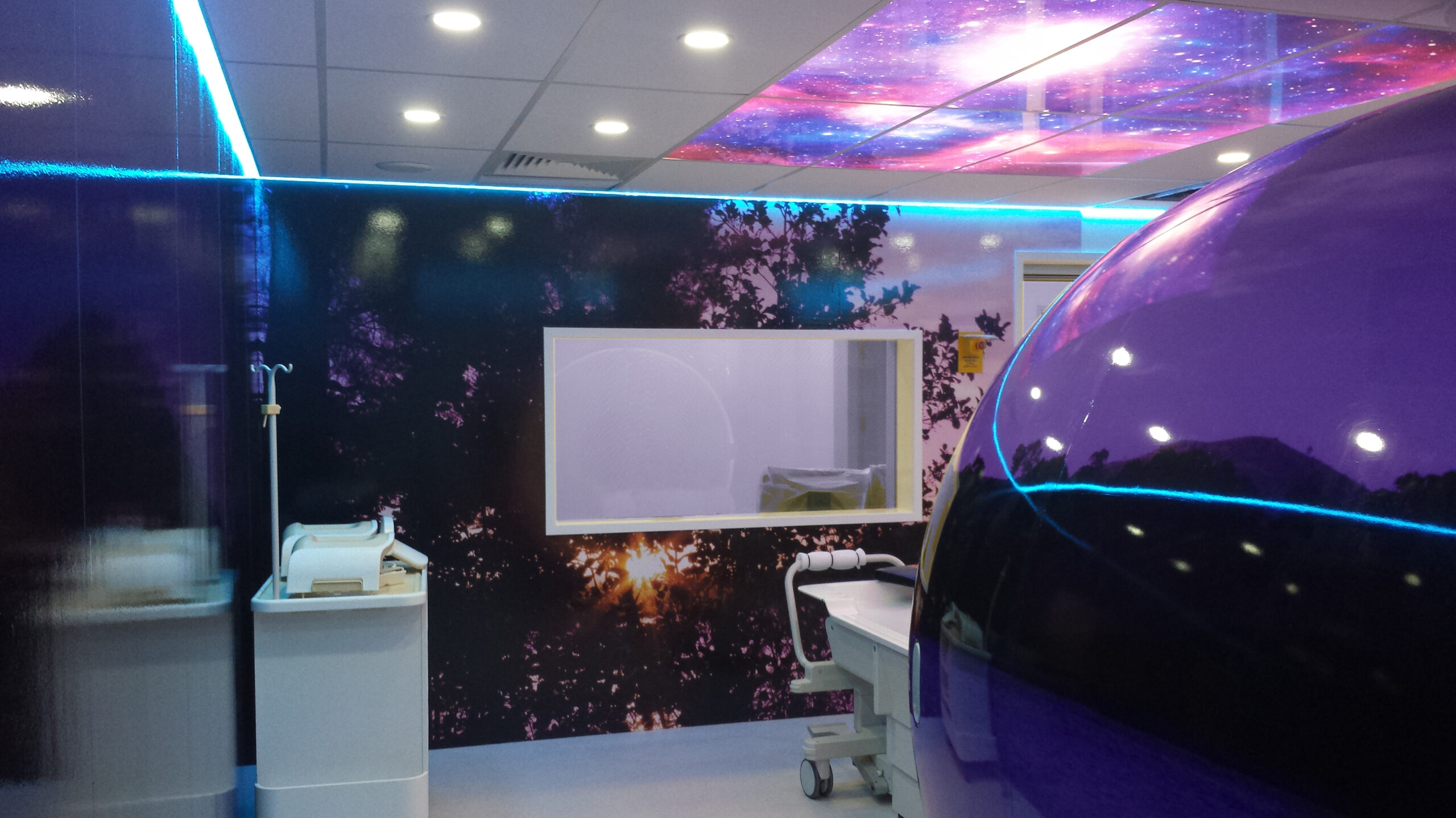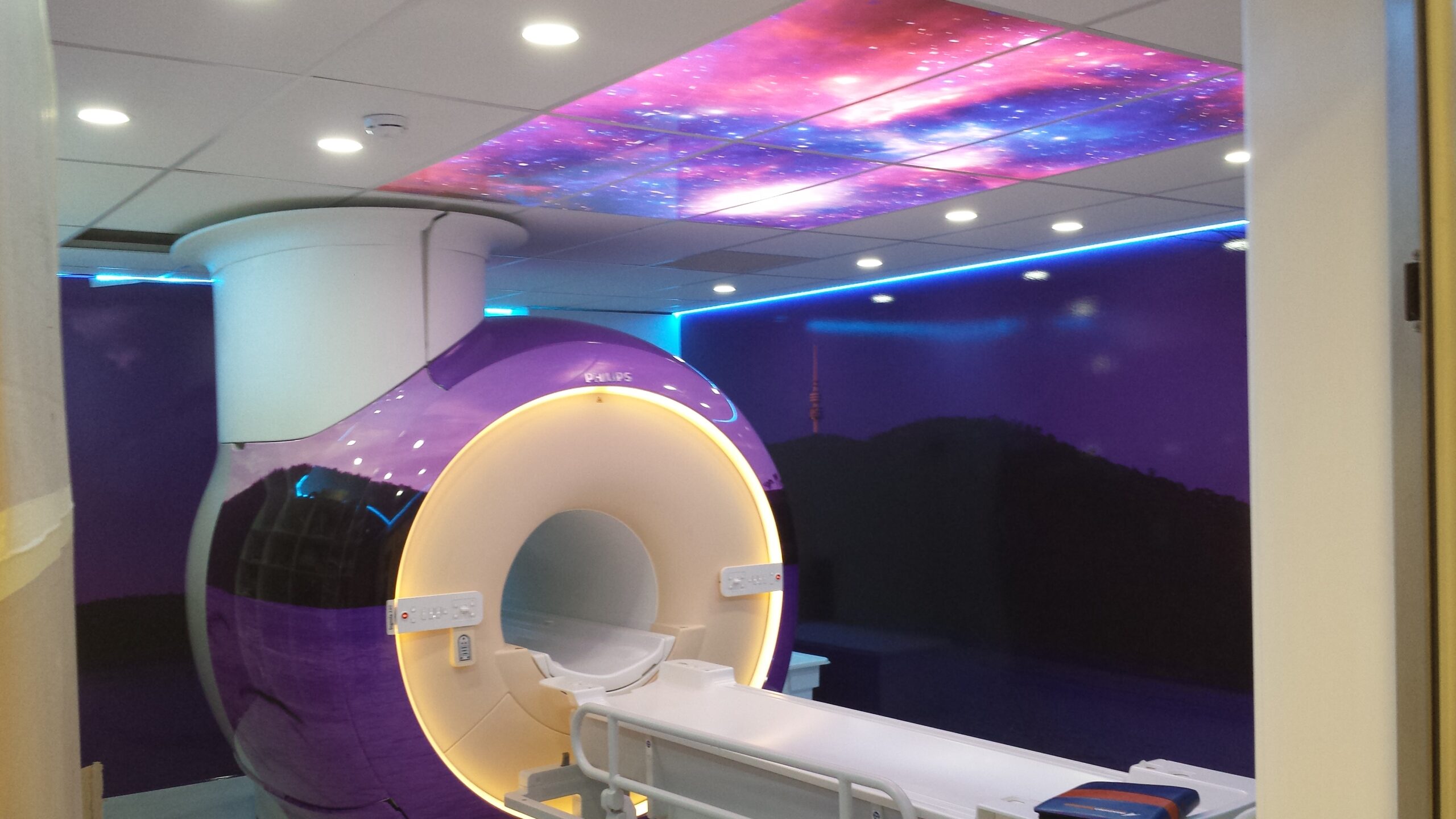 When preparing conceptual artwork for this installation, NCDI requested images to be taken from a nearby waterfront in Woden, Canberra at night and installed inside their MRI room. Sending inhouse photographer Kane Wallmann, Virtual Environments was able to capture the beautiful waterside at twilight in ultra-high-resolution imagery. Installation was completed in December 2014 and comprised of four Virtual Environment products: Vista Coat Wapp Wrap, Virtual View Skylights, Scanner Skin, and Mood Lighting. Combined, these products made massive impacts to patient and staff comfort and anxiety.