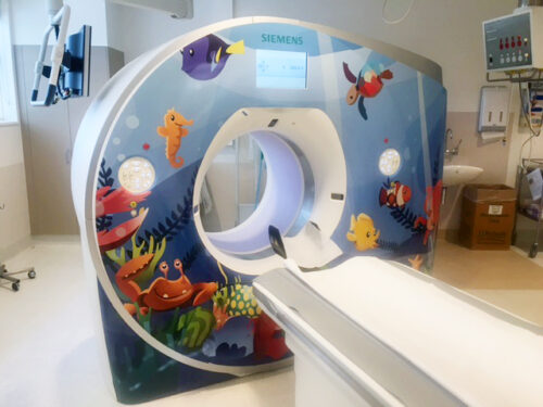 Virtual Environments has experience applying wraps to a range of different devices, from MRI and CT scanners, to ceiling suspension systems, mobile x-ray equipment, or even patient beds.